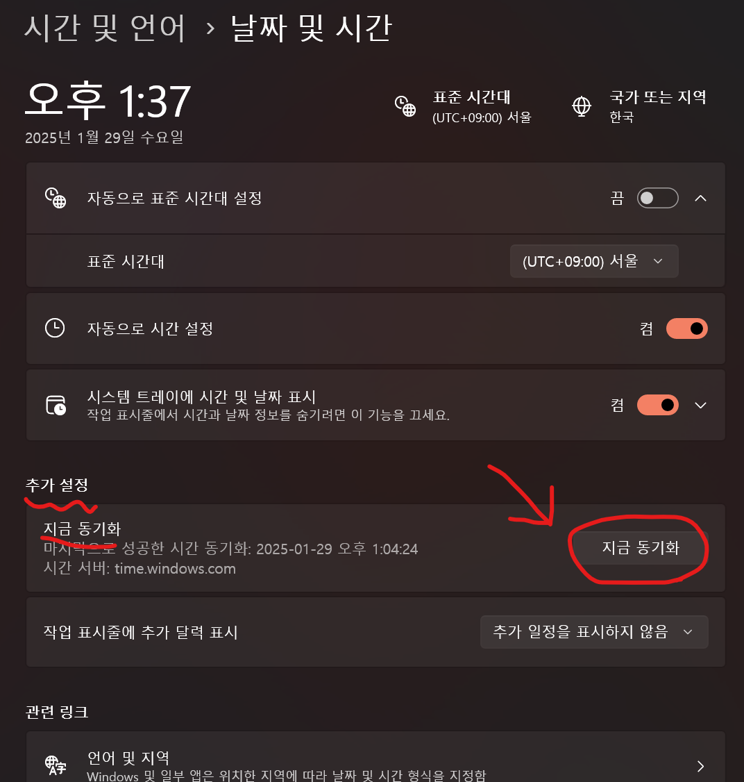 종종 생기는 윈도우 버그로, '시간 동기화'로 아주 쉽게 해결할 수 있습니다.